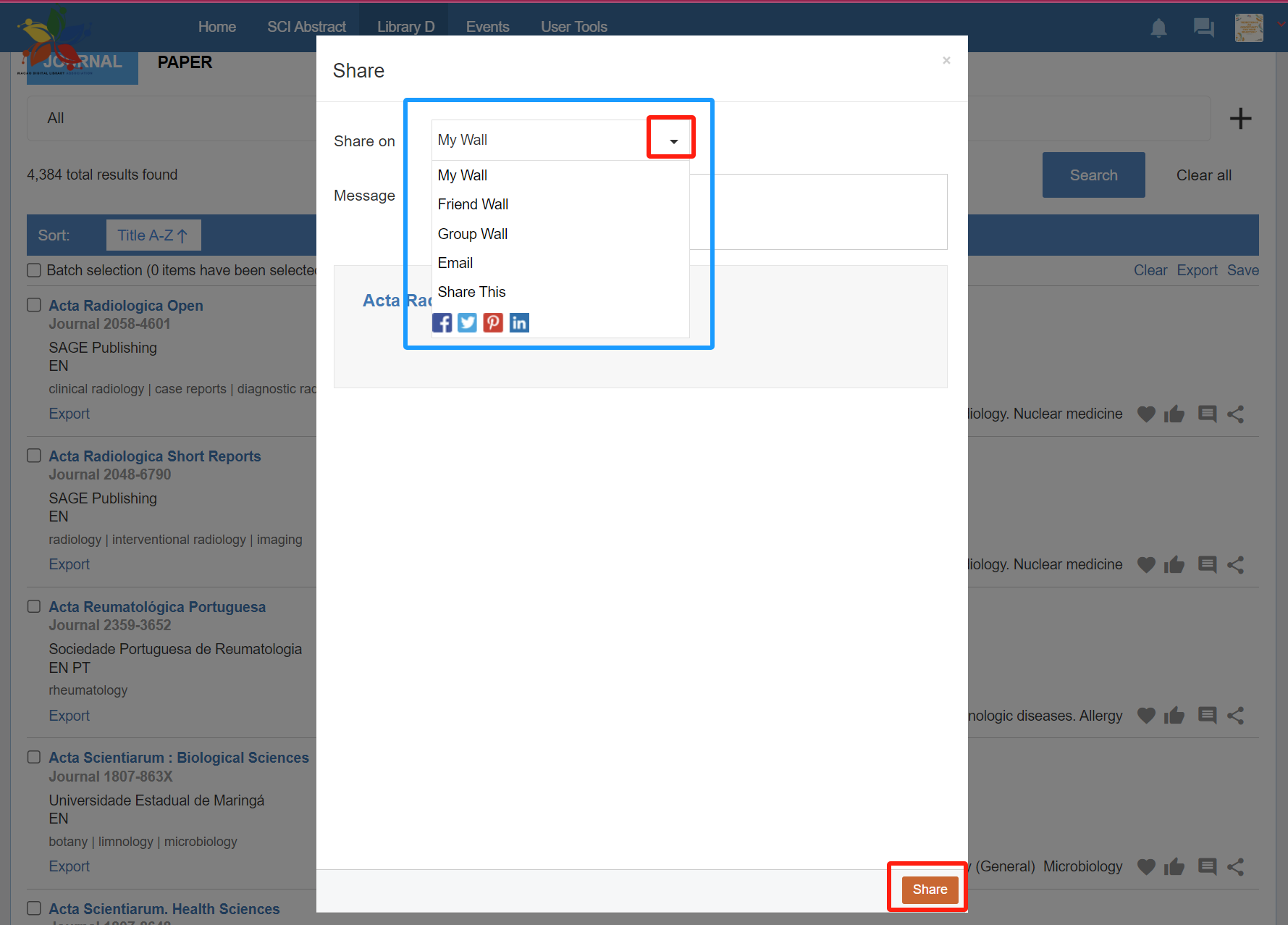 Share a journal to My Wall, a friend’s Wall, or via email, with an optional message.