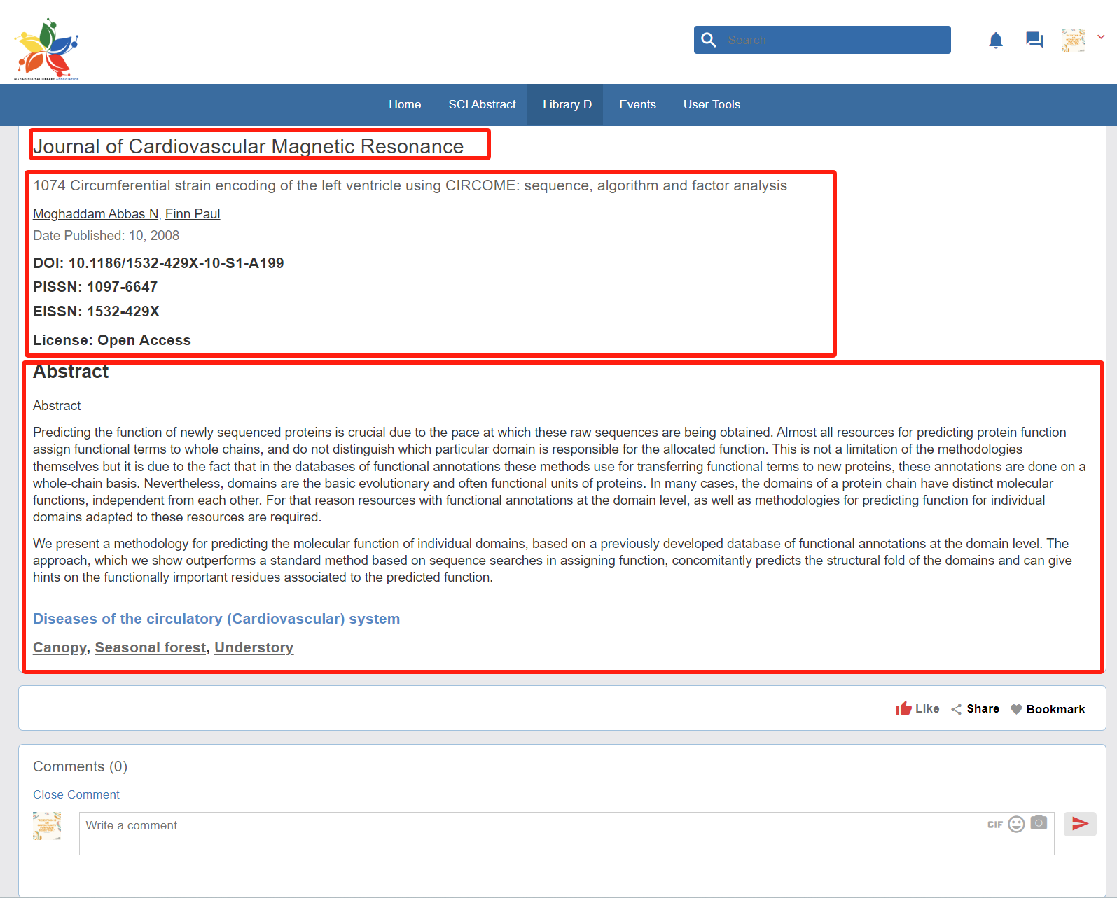 The single paper detail page displays complete metadata and provides options to comment, like, bookmark, or share.