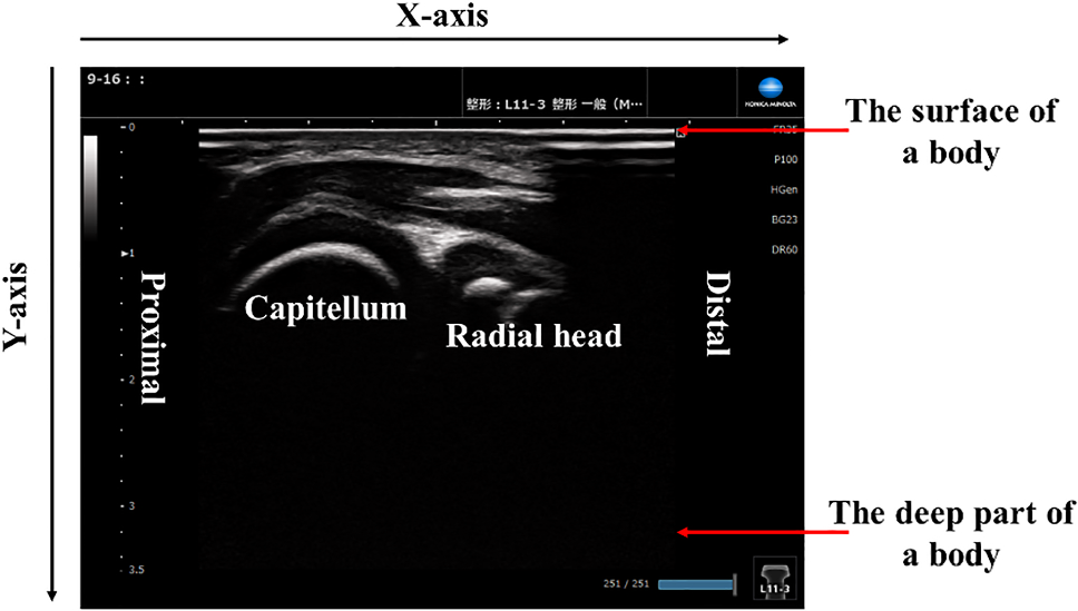 Subjects and materialsThe ultrasound images used in this experiment were taken by physicians experienced in medical check-ups of OCD using the five ultrasound systems shown in Table 1. The ultrasound images of the elbow were taken in the lateral posterior long-axis directions. Figure 1 shows ultrasound images of the elbow, where the humeral capitellum of the elbow is located on the x-axis and y-axis. The upper side of the image represents the surface of a body; while, the lower side represents the deeper part of the body (Table 2).