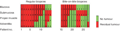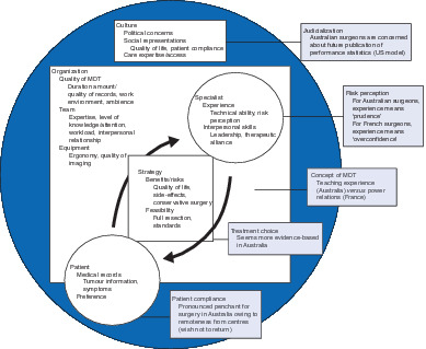 ResultadosDe 154 pacientes (97 en Francia versus 57 en Australia), el 32% tenía ymrT4 y el 68% tenía cáncer de recto con recidiva local. Las tasas de resección quirúrgica fueron del 87,6% versus 77,8% (P = 0,112). La tasa de concordancia en la decisión quirúrgica fue baja (coeficiente kappa = 0,314) con una tasa más baja de exenteración pélvica en Francia, tanto en la práctica clínica (46% versus 85%; P < 0,0001) como en condiciones teóricas (40% versus 88%; P = 0,002). La tasa de resección R0 fue menor en Francia para la LRRC (51% versus 86%, P = 0,007) pero no para el ymrT4 (81% versus 100%, P = 0,139). Las tasas de morbilidad fueron similares. Los pacientes que se sometieron a procedimientos no exenterativos tuvieron una subescala de funcionamiento mental más alta a los 12 meses (P = 0,04) y un nivel de angustia más bajo a los 6 meses (P = 0,04). El análisis cualitativo destacó 5 categorías de factores psicosociales que afectaron a la decisión del tratamiento: paciente, estrategia, especialista, organización y cultura.